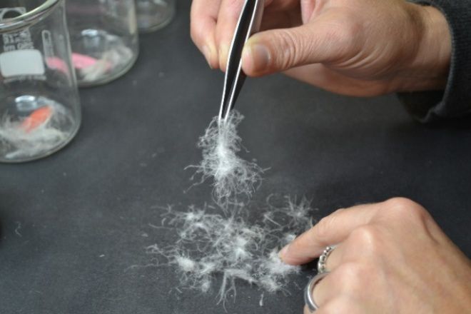 (按照不同的鹅绒含量比例而分别放置的原材料样品)